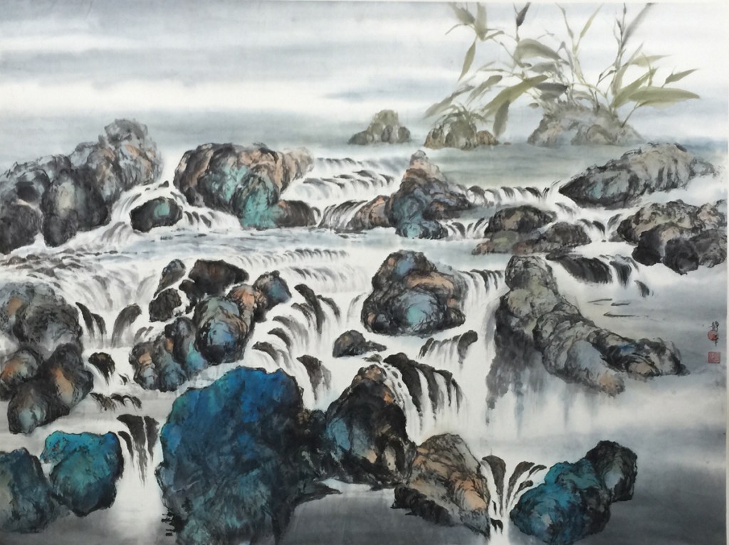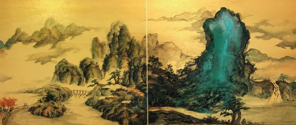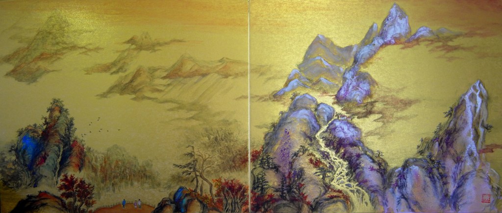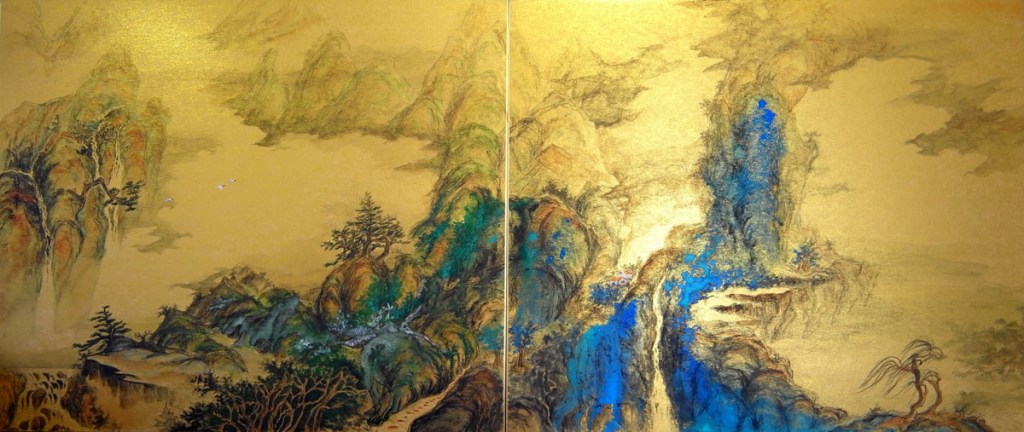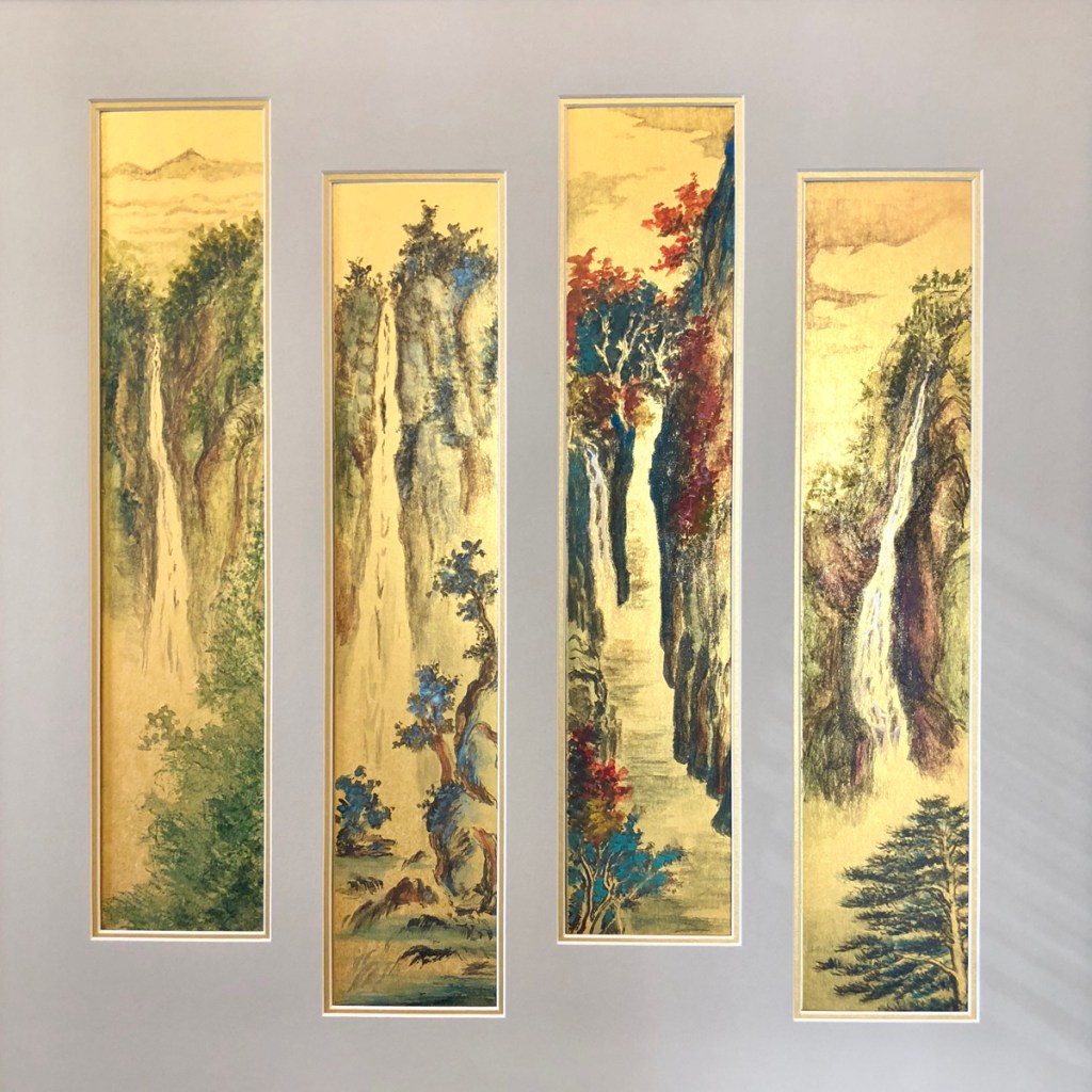 這兩年作了新嘗試,用四屛金咭撥彩去表達山水。四屛作品,兩張兩張裱起,看起來有電影院闊銀幕之效果,甚能表達天地之廣闊。