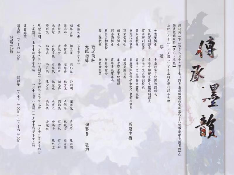 二月十二日開始一連五日嶺藝會在中央大會堂的「傳承·墨韻」畫展,由伍月柳教授率領三十三位畫家弟子,秉承嶺南畫派的創新精神,用不同題材、演繹方式及技巧,傳承中國水墨畫的墨韻。